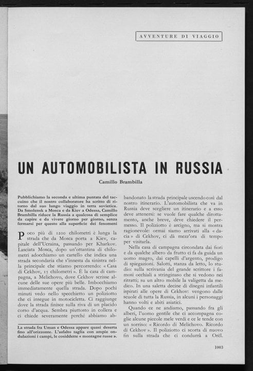 Nel novembre del 1965, le pagine delle Vie del Mondo tornano a raccontare di Ucraina, questa volta con un reportage di Camillo Brambilla intitolato “Un automobilista in Russia”, che racconta di un suo viaggio da Smolensk a Mosca e da Kiev a Odessa.