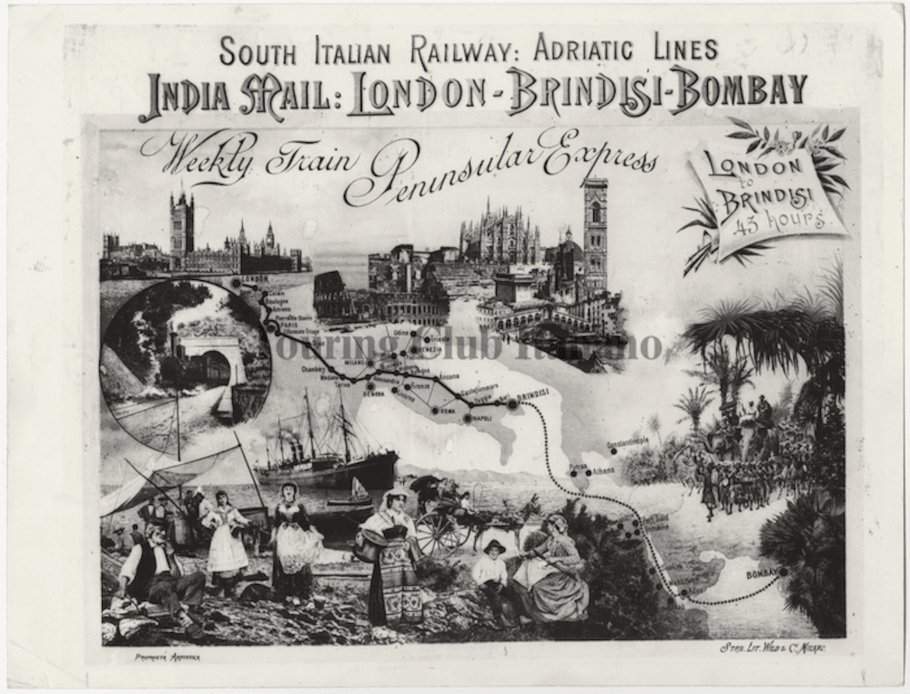 Un inserto pubblicitario si fa strada, nel volume “Puglia”, fra gli scatti in bianco e nero dei maestri della fotografia assoldati dal TCI: è una pubblicità della Valigia delle Indie, che dal 1870 al 1914, una volta alla settimana, trasportava passeggeri da Londra in India facendo tappa a Brindisi, dove il treno diventava un piroscafo che puntava direttamente a Bombay.